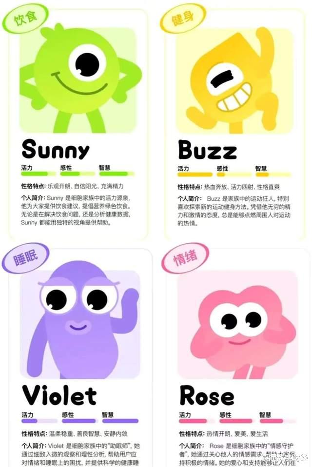 进入Mia后,用户可以根据自身减脂的需求选择4个不同的减肥伙伴,包括饮食助手伙伴Sunny,健身助手伙伴Buzz,睡眠助手伙伴“Violet”,以及情绪助手伙伴“Rose”。