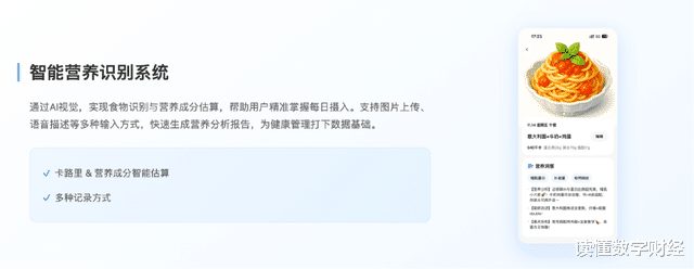 首先是智能营养识别系统。通过AI视觉,实现食物识别与营养成分估算,帮助用户精准掌握每日摄入。支持图片上传、语音描述等多种输入方式,快速生成营养分析报告。