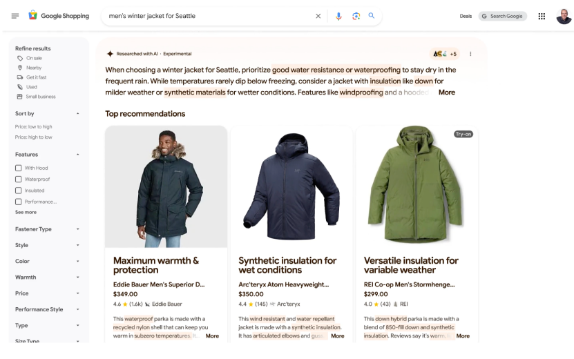这就不得不说到谷歌了。从ChatGPT购物功能的显示效果和互动逻辑来看,很像“谷歌购物(Google Shopping)”。去年10月的时候,谷歌购物进行了一次大升级,用Gemini重塑了一下。此外,更早之前谷歌也重塑了搜索引擎,在搜索时也会经由AI生成推荐列表。