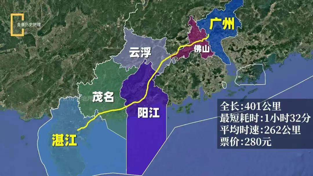这条高铁全程401公里,在广州为起点,经过佛山、云浮、阳江、茂名,终点站湛江。这条高铁修建,还是需要很强的基建能力的,遇山而穿,遇水搭桥。
