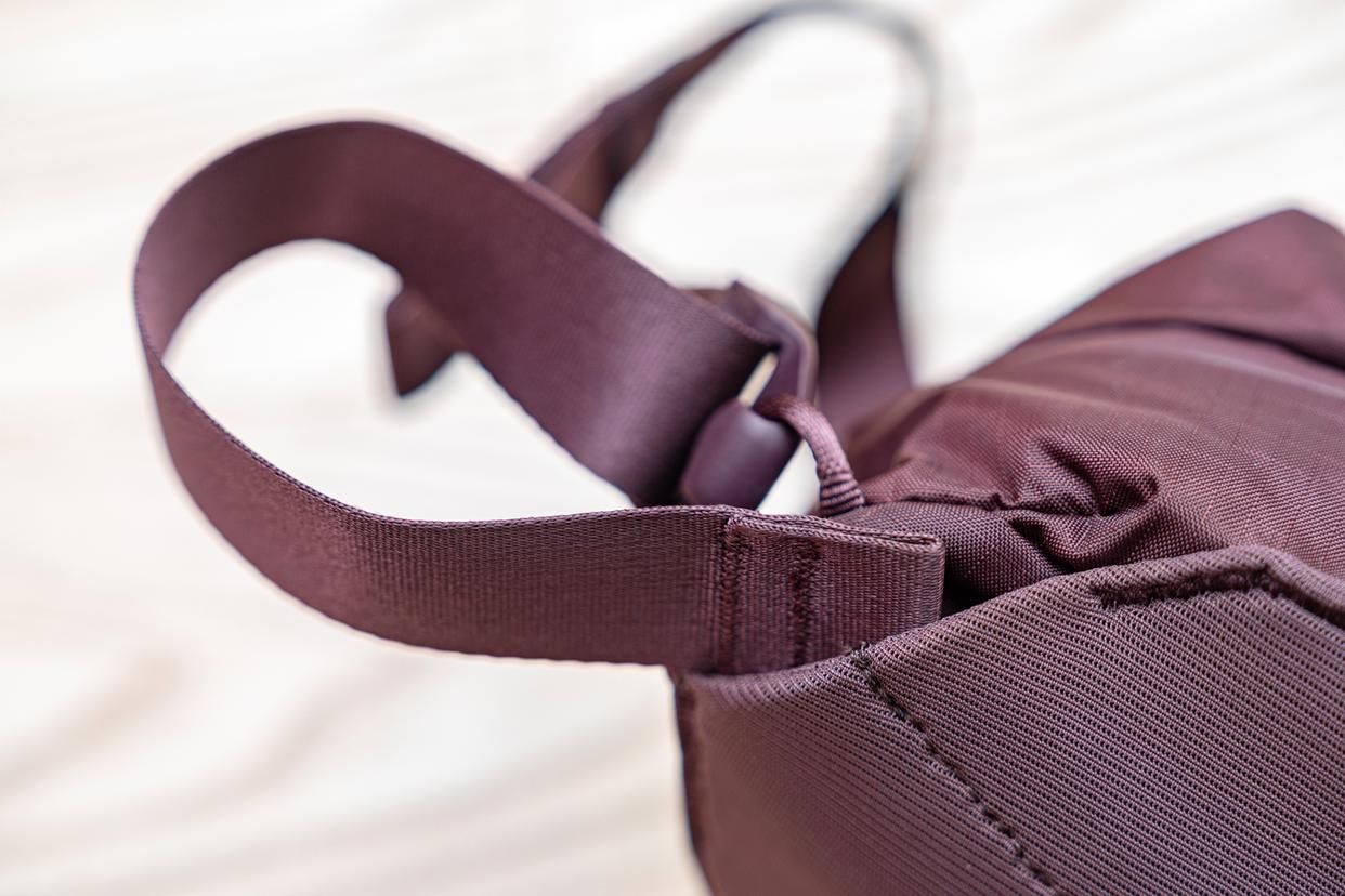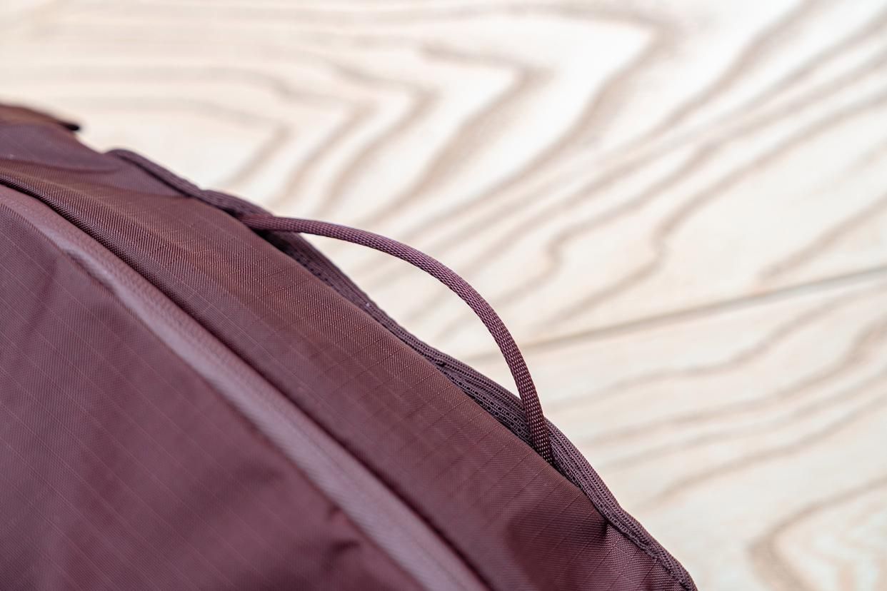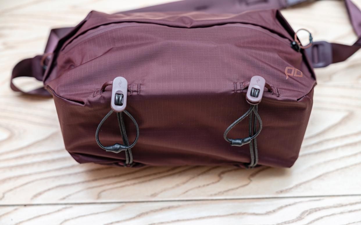 这款outdoor sling 7L 有三种配色,黑色、白色、酒红色,黑色肯定怎么选都不会错,白色特别好看,但是怕不耐脏,最后我就选了这个比较少见的暗红色,饱和度和明度都不高,也很有质感,最外层是Terra Shell 210D 防撕裂尼龙面料,也有一定的防泼水能力,并且 PD 的包都是终身质保的,不需要担心划痕。拉链上有相应配色的弹力绳,PD 的审美是越来越高了。