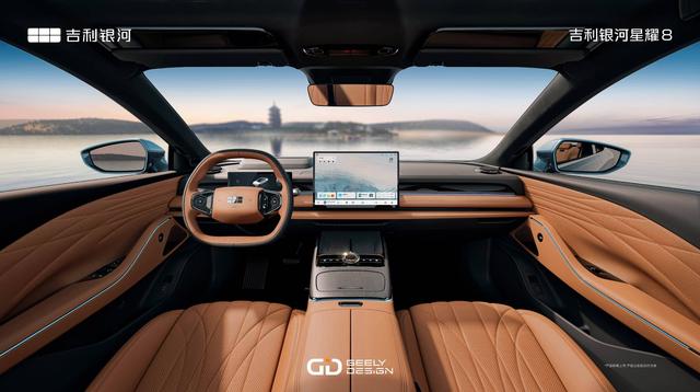 拉开车门,星耀 8 的内饰设计延续了外观传递出的调性,力求在座舱内营造出兼具文化元素与现代科技感的氛围。据介绍,设计师在细节中融入了「三潭印月」、「荷塘涟漪」等主题元素。