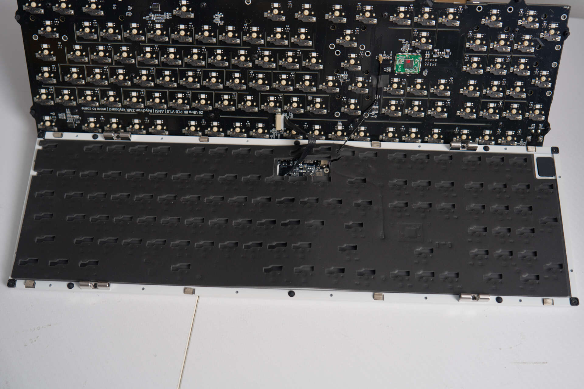 得益于小硅胶柱的柔性定位与支撑结构,键盘内胆可以直接整体提起。内部采用五层结构设计,PCB 电路板被上下双层消音泡棉完整包裹,本就已经具备相当出色的消音基础。但 Z6 Ultra 并未就此止步,底部还额外增加了一层底棉。这种近乎 “拉满” 的填充方案,搭配硅胶柔性连接结构,从根源上抑制共振与空腔音,最终呈现出扎实、统一、干净利落的顶级按键手感。