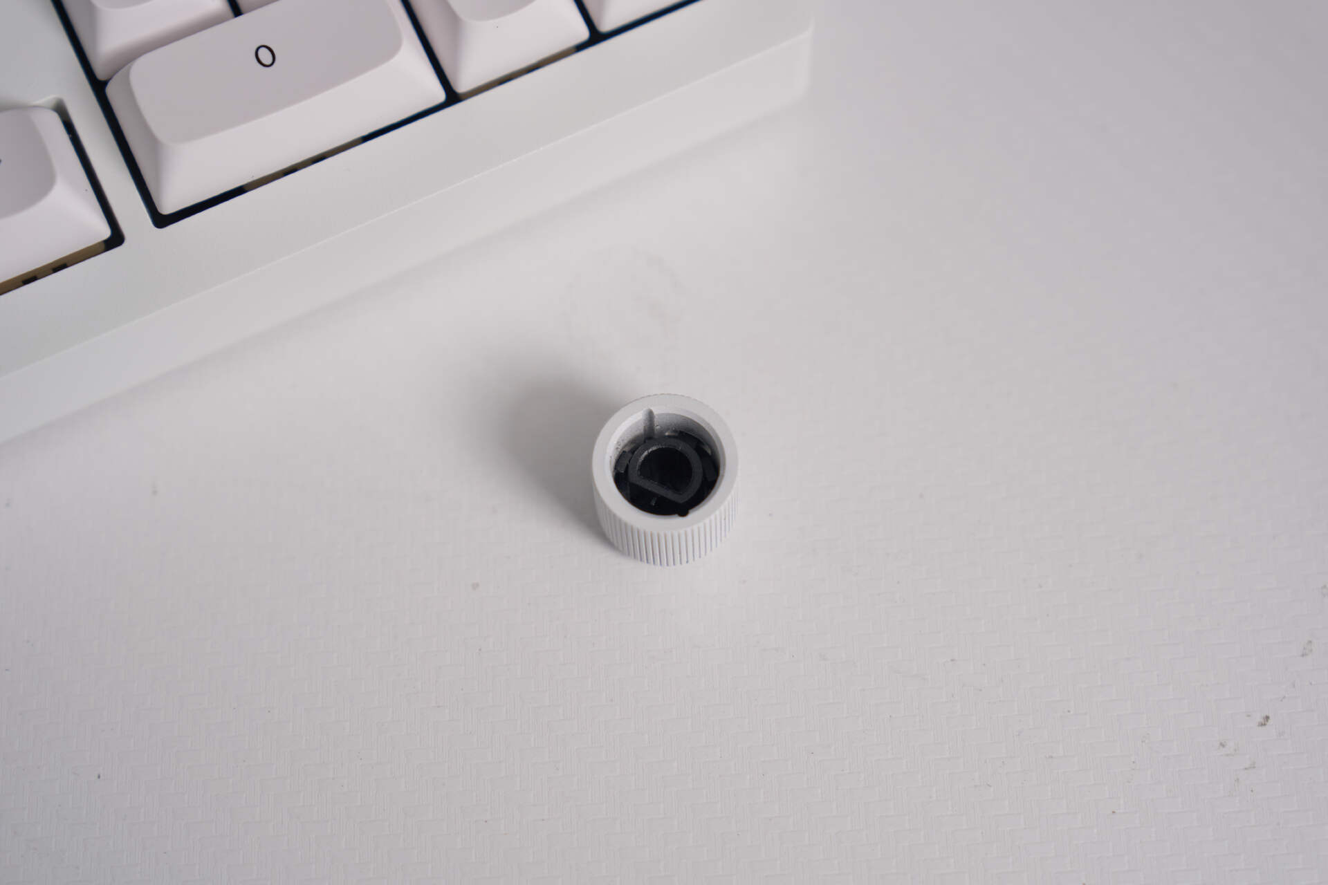 拆去音量旋钮后,只需捏住顶盖两侧轻轻向上提拉,即可松开内部卡扣完成拆卸,整体拆解过程极度简单、设计十分巧妙。顶盖依靠图中这种带有金属质感的构件进行固定,也就是 Keychron 标志性的碰珠快拆结构,依靠四组独立锁止装置,实现稳固扣合与便捷拆卸的平衡,也是这款键盘极具辨识度的特色设计。