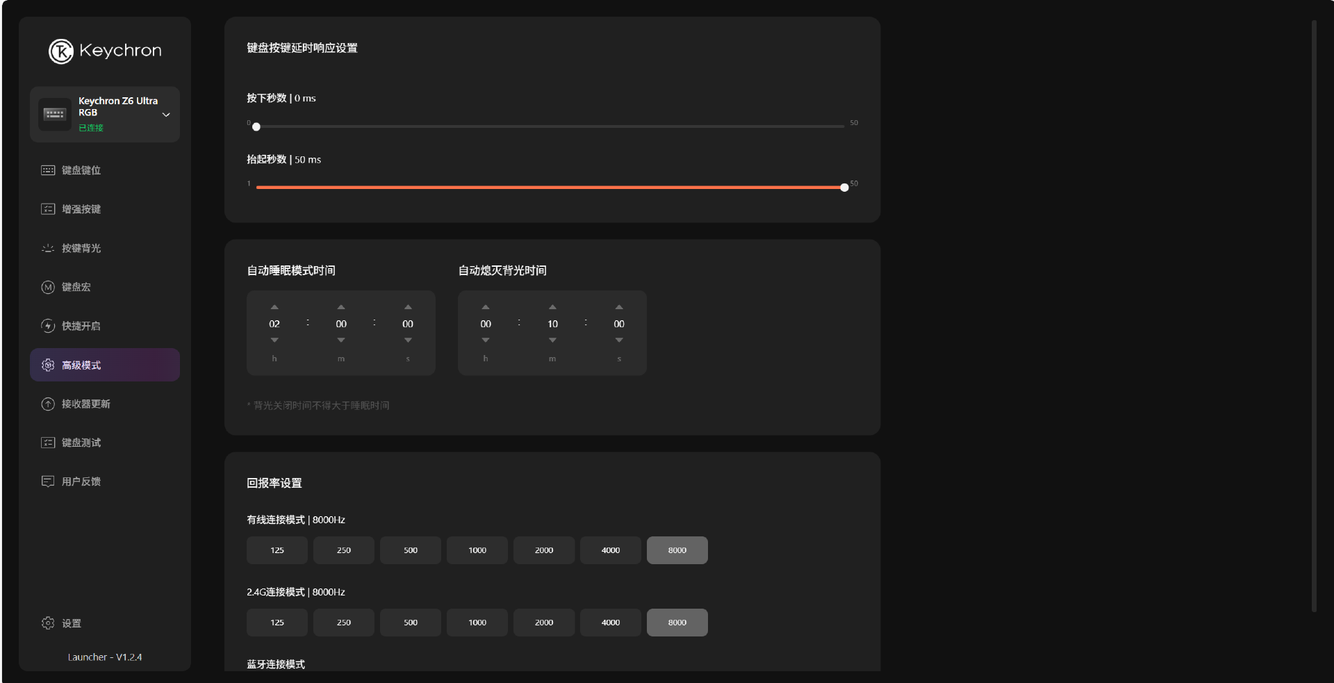 渴创驱动高级模式下可开启双 8K 回报率,延迟低至 0.125ms。蓝牙模式受协议限制,回报率固定为125Hz,响应速度显著下降,电竞场景不建议使用蓝牙连接。