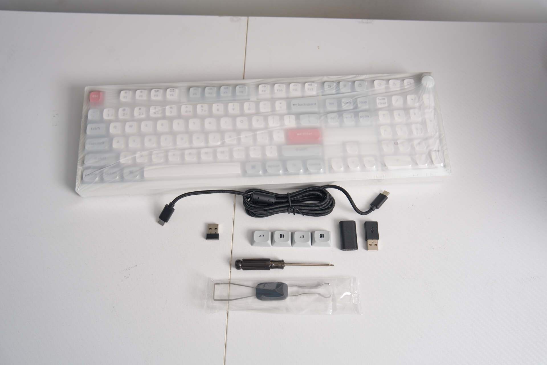 标配的配件清单看似常规,实则暗藏不少实用细节。除了二合一拔键拔轴器、支持双 8K 回报率的 2.4G 无线接收器,还附带了带磁环的双 Type-C 编织数据线,以及 Type-C 转 A、A 转 C 双接口转接器,同时配备了内六角螺丝刀与 Windows 系统增补键帽。键盘默认搭载 Mac 适配键帽,也直接点明了产品的核心设计调性,整体风格偏向简约精致的苹果生态取向,兼顾颜值与跨平台实用性。考虑到 PC 端本就稀缺的 Type-C 接口,厂家贴心配备双接口转接器,这个细节必须点赞,真正兼顾了不同设备的接口适配需求,实用性拉满。而键盘的防护细节同样让人眼前一亮,整机还特地做了独立封膜处理,玩键盘这么多年,这般严谨细致的防护设计还是第一次见,足以看出厂家对产品质感和运输保护的重视程度。