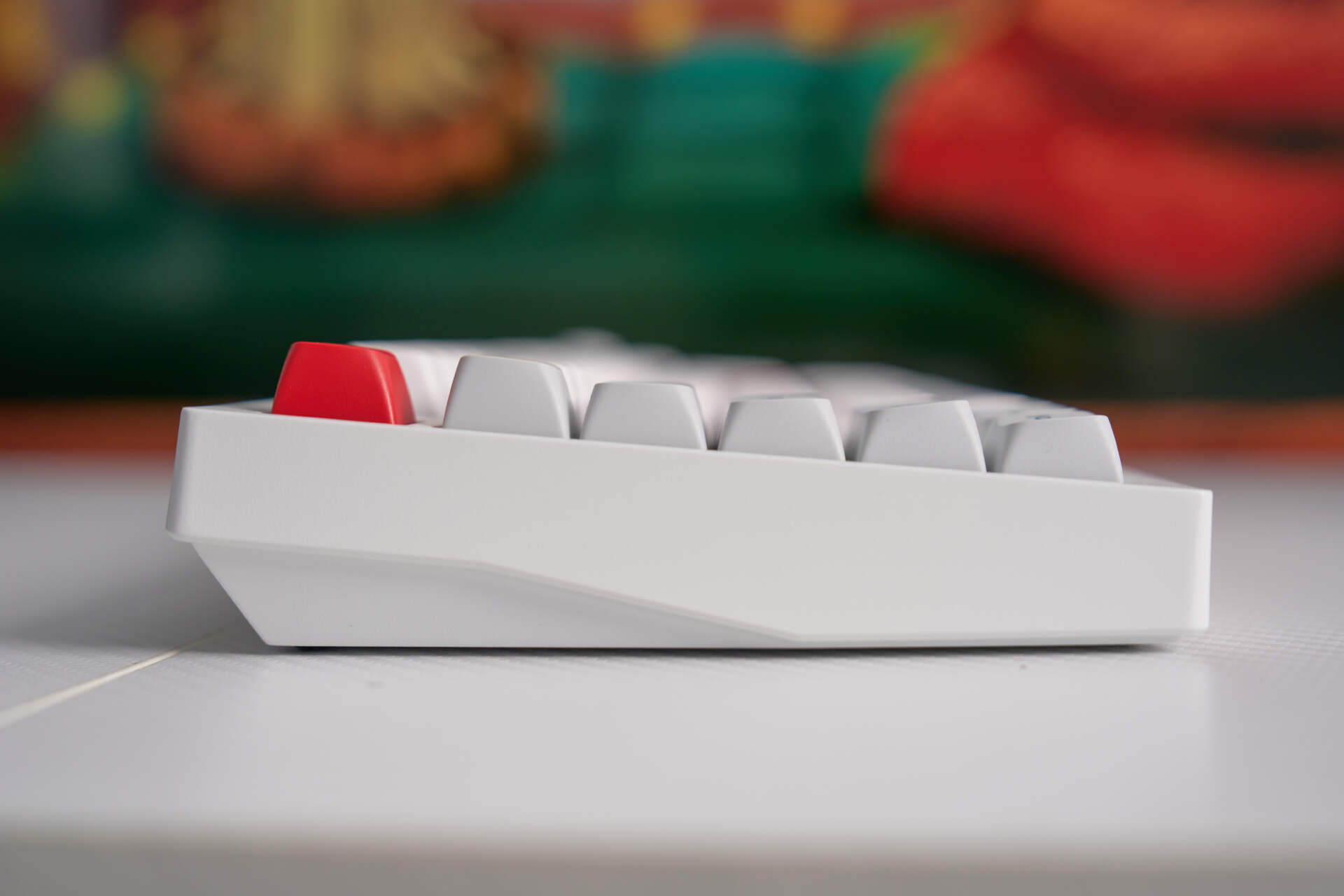 这款键盘提供黑白两款配色可选,我手上这台以白灰为主色调,ESC 和回车键采用红色键帽做点缀,视觉层次鲜明,辨识度拉满。