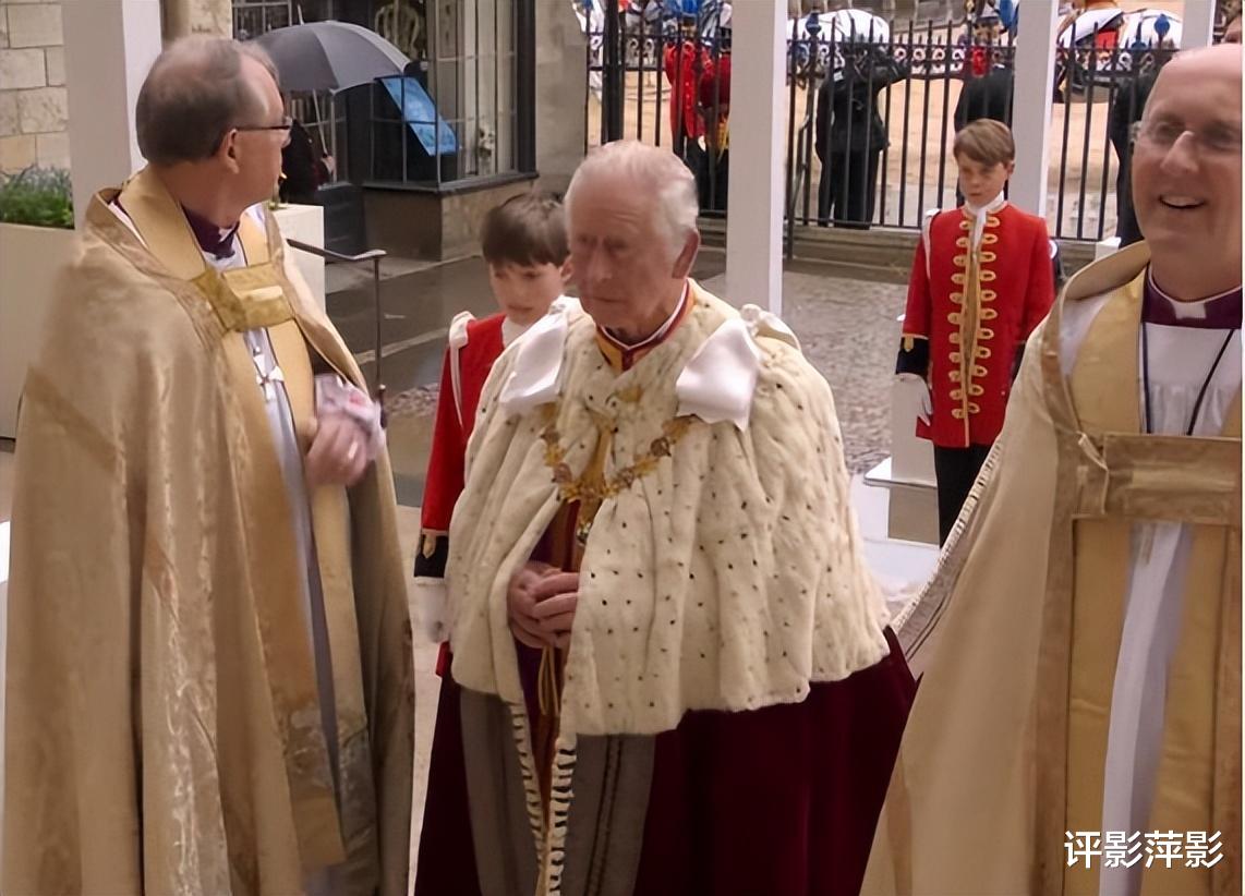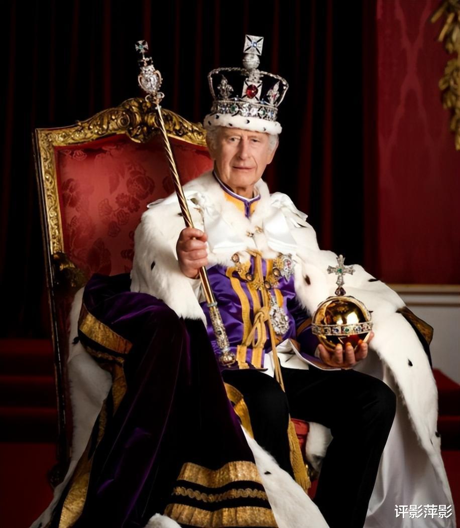 而第二张照片则更具有历史意义,是查尔斯国王,当今威尔士亲王威廉,以及乔治王子,他们祖孙三代的合影。查尔斯坐在国王宝座之上,左手托着君主金球,右手拎着权杖,头戴爱德华王冠,一派严肃神情。而威廉王子和乔治王子则是分别站在他两侧,这也意味着今后的王位传承脉络。