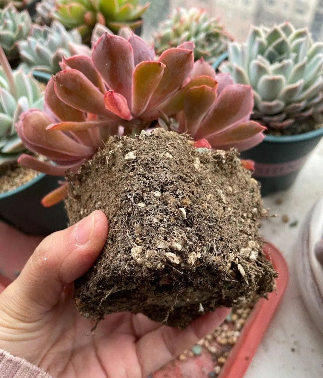一般多肉浇水有个缓解期,就是多肉对这个水分吸收的时间,年轻健壮的多肉缓解期较短,浇水频率快。而老桩的缓解期慢,慢个几天到一个星期,如果水分还未见吸收,这个时候要考虑修根重新上盆。一是抖落旧土后用放大镜检查根系,健康根呈乳白色带绒毛,病根呈褐色透明状;二是保留3-5条主根(长度8-10cm),剪除所有须根(切口45°斜角);三是用双氧水消毒后涂抹草木灰,悬挂在湿度60%环境晾根5-7天;四是用生根粉溶液(1:2000)浸泡30分钟,置于通风散射光处缓根。