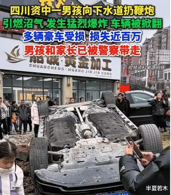一名男孩因贪玩将鞭炮扔入化粪池,扔完鞭炮后迅速跑开,结果引发沼气爆炸,化粪池井沼气瞬间被引爆,巨大的冲击力将周围多辆汽车掀翻。现场那叫一个混乱,多辆豪车被波及,像林肯、奥迪、路虎、保时捷、雷克萨斯等,网传受损的汽车中有多辆豪车,网传其中雷克萨斯被炸飞后砸到奥迪A8上。不幸中的万幸,没有人员伤亡。