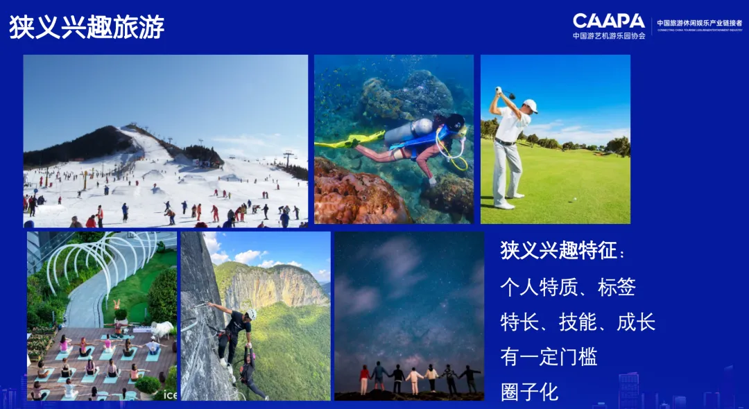 狭义的兴趣旅游指滑雪、潜水、长距离徒步、溯溪、攀岩、高尔夫、观星旅游等。这类兴趣属于特长和技能性质,需要一定的学习入门,与个人特质、个人标签深度绑定,并且这类活动有圈子化的属性,经常是一个圈子的成员一起学习、一起体验、一起开展活动。