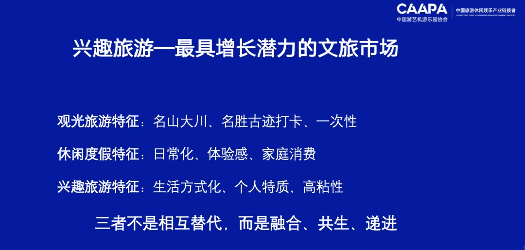 需要强调,观光旅游、休闲度假和兴趣旅游三者不会相互替代,而是融合、共生和递进。只是,未来文旅市场的增量主要在兴趣旅游。