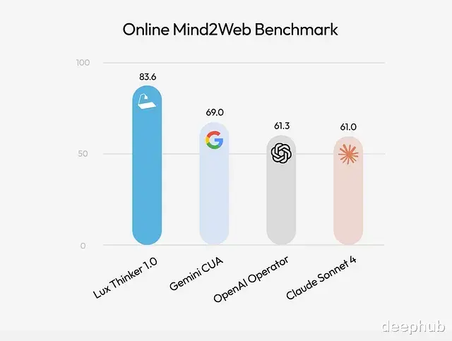 在 300 个实际场景的测试中,Lux 的表现超过了 Google Gemini CUA、OpenAI Operator 和 Anthropic Claude。