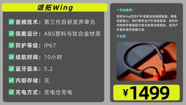 总结:颂拓Wing以户外场景精准适配、扎实防护性能与实用功能配置为核心竞争力,运动佩戴稳定性突出,特别适合登山、骑行等专业户外场景用户。对于音质质感要求不高,更注重户外使用安全性与可靠性的用户,可优先考虑这款装备。