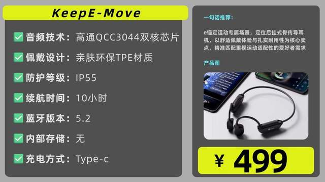 KeepE-Move聚焦运动专属场景,定位后挂式骨传导耳机,以舒适佩戴与扎实耐用性为核心卖点,成为重视这两大需求的运动爱好者的务实之选。