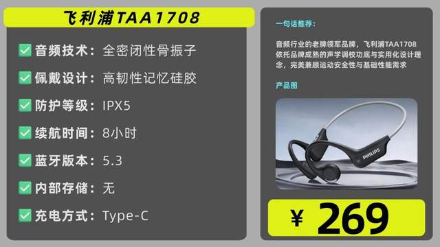 总结:飞利浦TAA1708适配日常通勤与轻运动场景,整体性价比优势突出。对于预算有限,同时追求开放聆听体验的通勤族与轻运动爱好者来说,这款耳机兼顾舒适与实用,是值得信赖的选择。