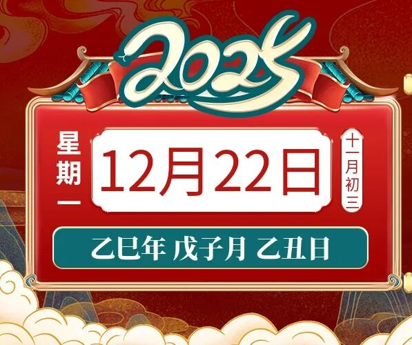 2025年12月22日,星期一,农历十一月初三 (乙巳年戊子月乙丑日),法定工作日。