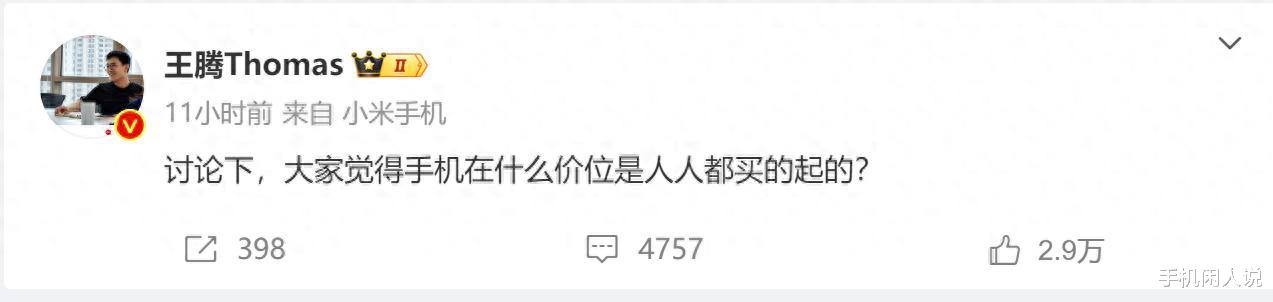 小米REDMI品牌总经理王腾,发了个讨论,表示大家觉得手机什么价位是人人买得起的?这无疑是针对这两天手机圈最大热点,那就是华为Pura x售价7499元起,华为高端系列价位自然不低,主要是余承东之前的一番话。