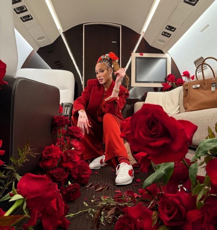 2025年情人节前夕,库兹马在加勒比海的私人飞机上,用满舱的红玫瑰、气球、巧克力和香槟,给了哈洛一个大大的惊喜。