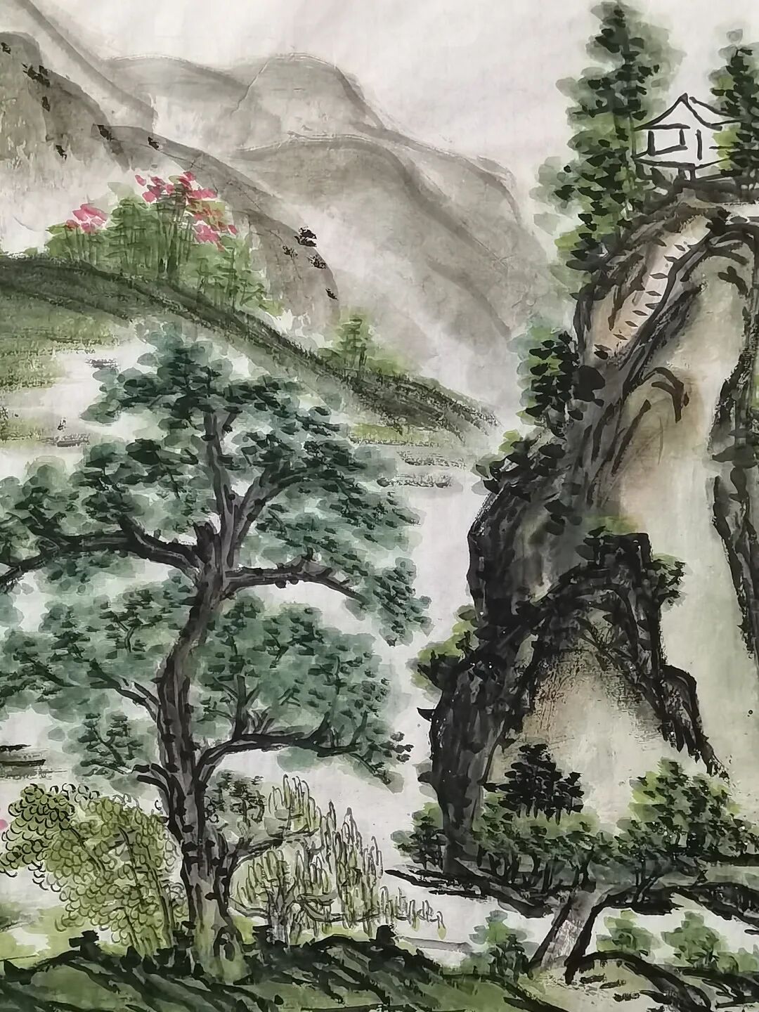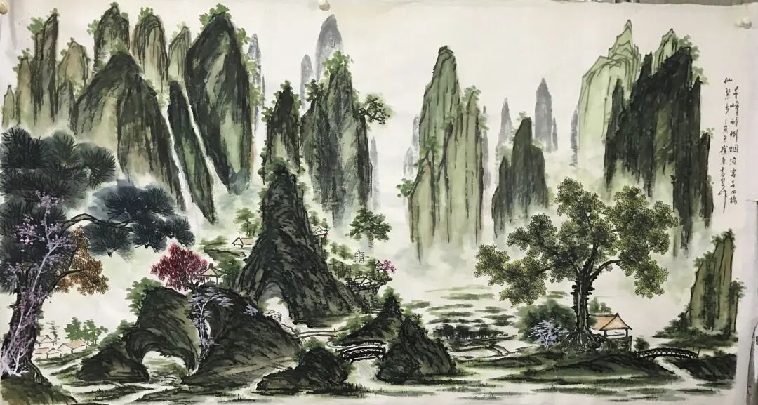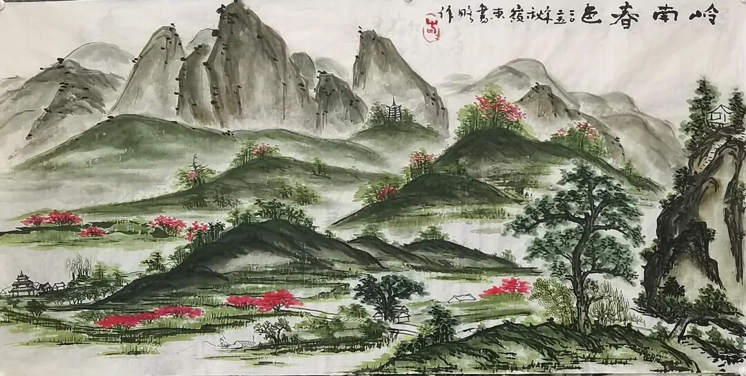 真正让陈书略山水画脱颖而出的,是其“中西结合”的创新探索,尤其是对色彩的大胆运用。传统山水多以水墨为宗,色彩常作辅助,而他却打破这一惯例,如作品《深山藏福音》将西方绘画中对色彩层次、光影效果的把控,融入中式山水的笔墨框架中,造就出“浓烈丰富”的色彩效果。如作品《岭南春色》这种融合绝非简单的“水墨加色彩”,而是让色彩与笔墨相互成就:墨色的浓淡为色彩铺垫了层次,色彩的饱和又为山水注入了鲜活生命力,既避免了传统水墨可能的单调,也规避了西方色彩易显的浮躁,让山水既有“墨分五色”的雅致,又有视觉上的冲击力,仿佛让观者能透过画面,触摸到山河的厚重肌理与鲜活气息。