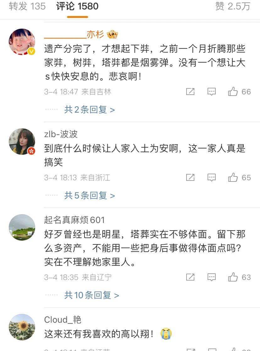 相较于分财产,更具争议性的是对大 s 最后一程的处理。一开始说由小 s 老公操办,但没看到具体如何操办,后来又多次看到说具俊晔在找墓地。从最初把遗体放在家里,到提及树葬,再到如今说的塔葬……据说塔葬也有好几种情形,有些是一个塔上有好多个格子,大家共用,把骨灰放进去就行。也不知那边会不会就只是给大 s 买了一个小格子而已,新闻标题居然说什么与“邓丽君”相邻,也不知道能否像邓丽君那般走得体面。