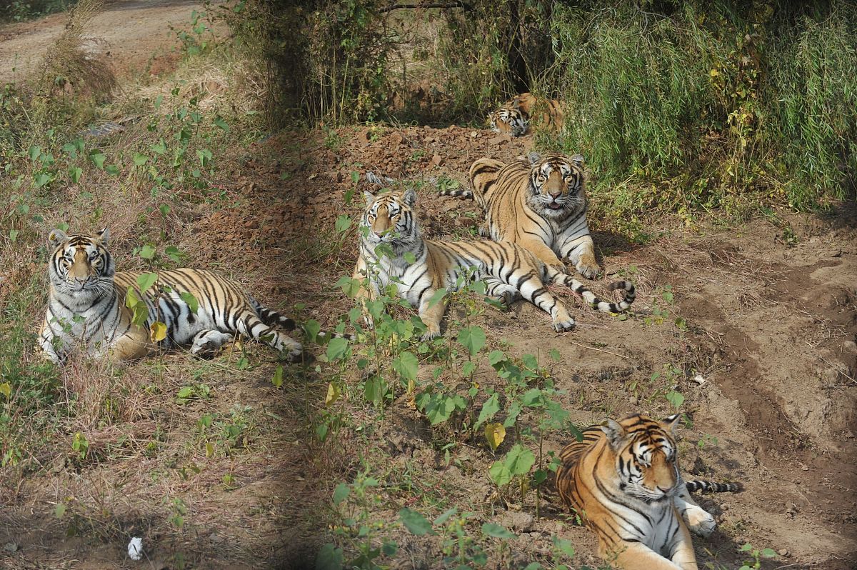 画面中,两只雄性东北虎与四只雌虎在雪地中悠然踱步,彼此保持着安全的社交距离。专家通过虎纹识别确认,这群"大猫"分属三个不同的家庭单元。这种高密度聚集现象在野生虎研究中极为罕见——全球范围内,此前仅有俄罗斯锡霍特山脉保护区在2013年记录到五虎同框的场景。