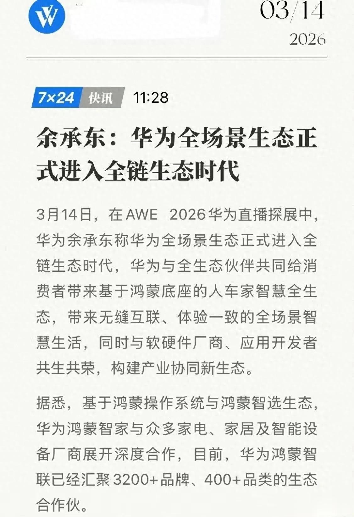 3月14日AWE2026华为直播探展上,余承东直接官宣,华为全场景生态正式迈入全链生态时代,靠着鸿蒙这个底层底座,要把人车家全场景智慧生活彻底打通,这话一出来,直接在数码圈掀起了轩然大波。