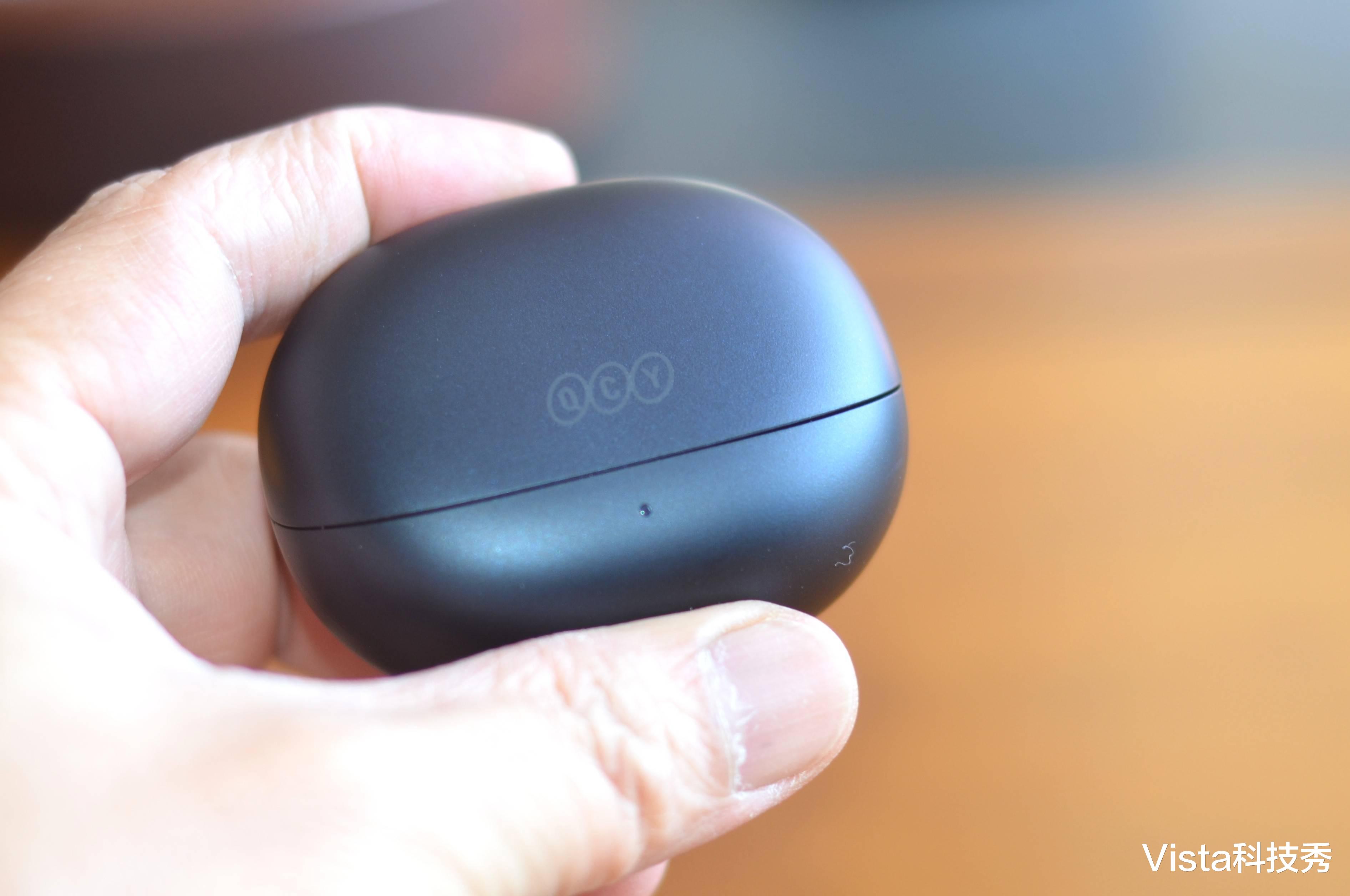 QCY N20共推出花语紫、午夜黑、皓月白三款配色,我选择的是午夜黑色款,充电仓采用鹅卵石圆型设计,磨砂材质防滑还不易沾染指纹,整体精致小巧便携,充电仓正面有品牌LOGO,下方为电量指示灯。