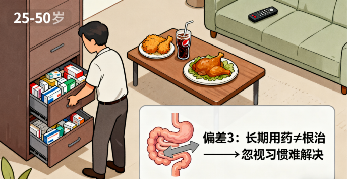 第三种认知偏差是认为 “长期用产品能‘根治’胃肠问题”,所以长期依赖缓解胃肠不适的产品,而不改善根本的生活习惯,结果导致胃肠问题一直无法得到根治,甚至可能因为长期使用产品,对身体造成其他不良影响。很多人觉得,只要长期坚持使用缓解胃肠不适的产品,就能彻底解决胃肠问题,所以一直依赖产品,却不调整自己的饮食、作息、情绪等可能导致胃肠问题的根本因素。但实际上,缓解胃肠不适的产品主要是用于临时改善轻微的症状,而不能从根本上 “根治” 胃肠问题。胃肠问题的根本解决,需要依靠长期良好的生活习惯,比如规律饮食、规律作息、保持良好情绪、适量运动等。如果长期依赖产品,而不改善生活习惯,胃肠问题的根本原因没有消除,胃肠仍然会持续受到伤害,不适症状也会一直存在,无法得到根治。而且,任何产品长期使用都可能存在一定的风险,可能会对身体的其他器官造成负担或产生不良影响。