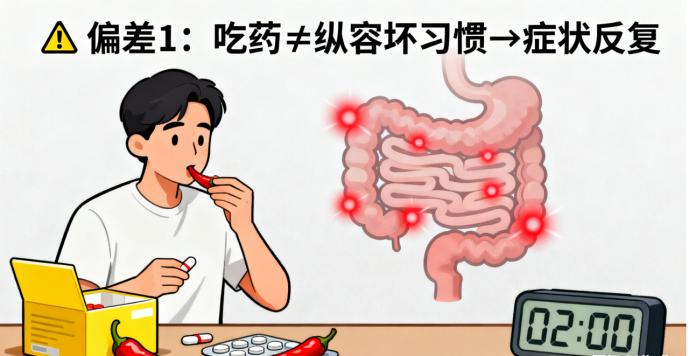 第一种认知偏差是认为只要吃缓解胃肠不适的产品,就不用调整不良习惯,比如继续熬夜、吃辣,结果导致症状反复出现。很多人觉得,只要吃了能缓解胃肠不适的产品,不管自己有没有熬夜、有没有吃辛辣刺激性食物,胃肠不适都能得到解决。但实际上,缓解胃肠不适的产品主要是针对已经出现的症状进行缓解,而不能消除导致胃肠不适的根本原因。熬夜会打乱胃肠的正常作息,影响胃肠的修复和消化功能;辛辣刺激性食物会刺激胃肠黏膜,加重胃肠损伤。如果在服用缓解产品的同时,仍然保持这些不良习惯,胃肠就会持续受到伤害,导致不适症状反复出现,甚至加重。比如有些人在出现胃部灼热感后,服用了缓解产品,症状有所改善,但之后仍然继续熬夜、吃辣,结果胃部灼热感很快又会出现,而且一次比一次严重,形成恶性循环。