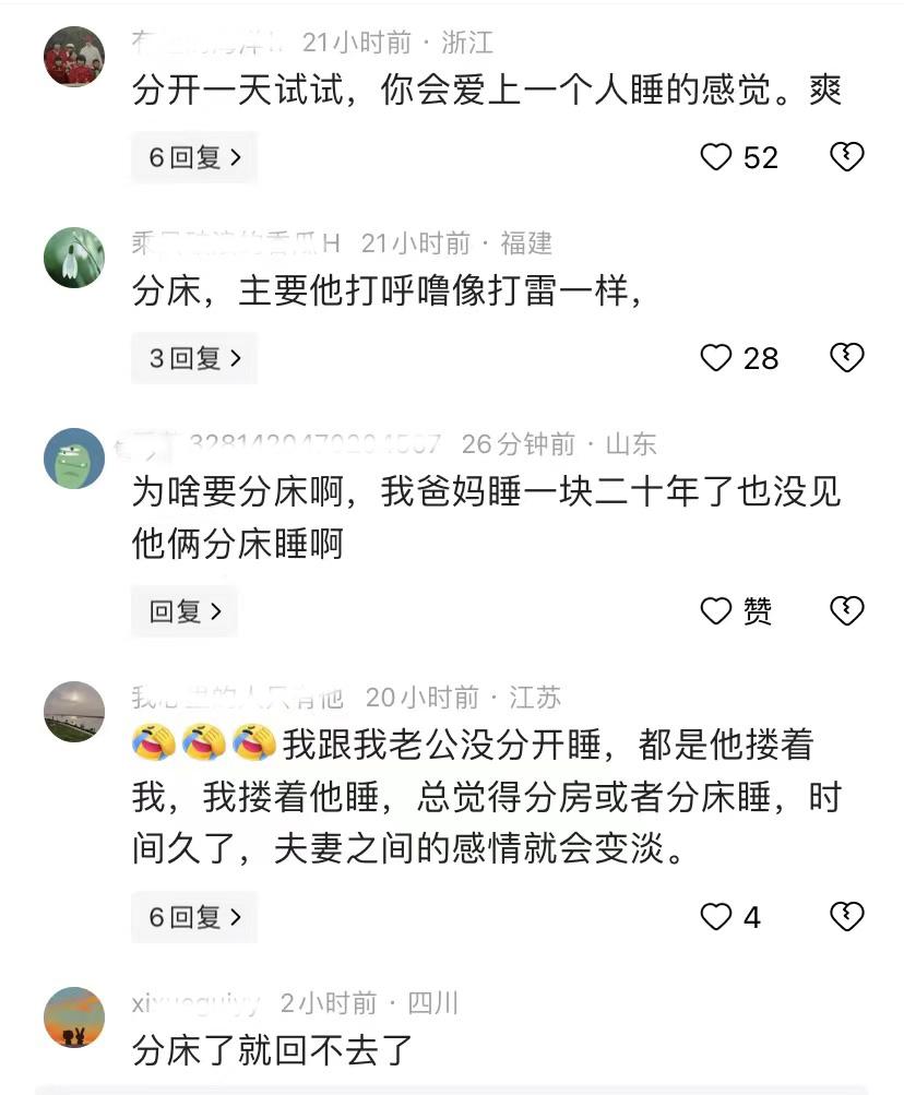 这位网友说,二十几年了。都没分床,也没分被,老公不予许,说分了床感情就会淡了。不结婚的偷着谁,结了婚分开睡,图什么?