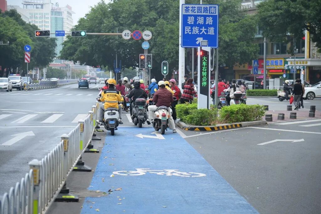 近日,南宁市在长湖茶花园路口等5处电动自行车流量密集区域完成安全通道智能化改造,通过铺设蓝色防滑路面、增设AI语音提示系统,实现非机动车与机动车分流通行。当未佩戴头盔的骑手经过时,LED屏会自动显示警示语并播报“请佩戴好头盔”,大型车辆右转时同步触发“大车右转必停”语音提醒。