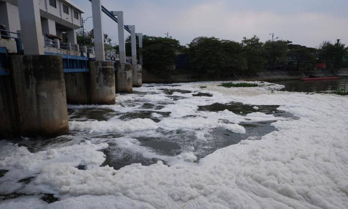 在那种脏水池子里,只要有水流运动,一定会产生各种五颜六色,稀奇古怪的泡沫。这是常见现象,我们身边现在只要出现,就可以举报给环境保护部门。