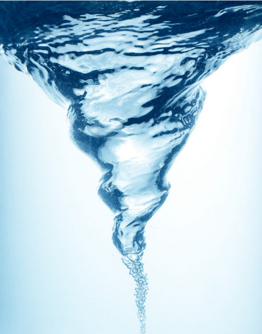 但只需很短的时间,这种无规则的状态,就会自发转变成一种有序的状态:水分子们开始整体旋转起来,形成一个光滑的螺旋通道,用比之前混乱落下的速度快很多的效率,流畅的通过出水口。