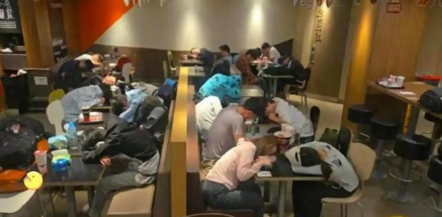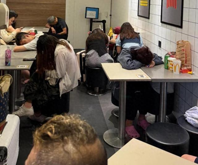 深夜的旺角麦当劳秒变“难民营”,外套当被子的,光脚刷短视频、行李箱堵过道——活脱脱一幅香港游浮世绘。