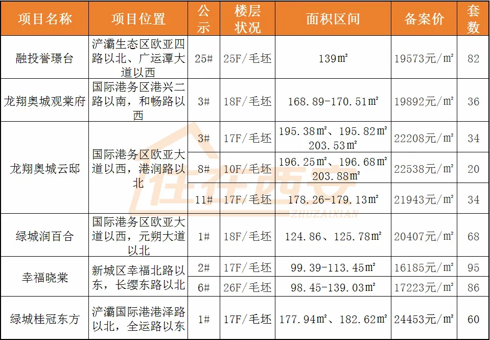 近日,西安6盘515套房源公示一房一价。价格公示项目主要集中在浐灞国际港:融投誉璟台、绿城润百合、绿城桂冠东方、龙翔奥城观棠府、龙翔奥城云邸;另外新城区的金茂贝好家幸福晓棠也加推了181套房源。