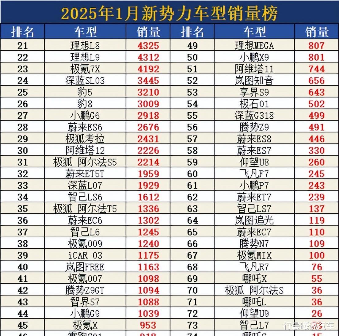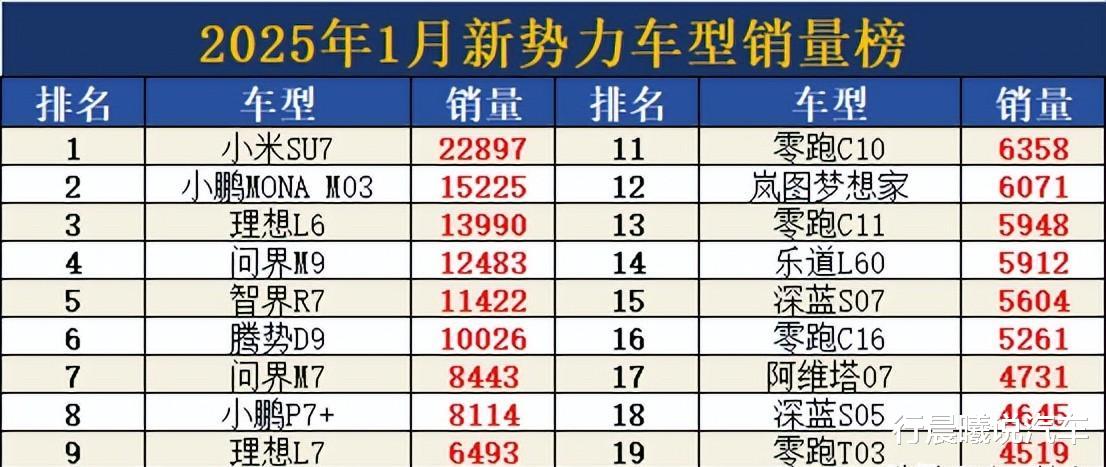再看看具体的销量数据。小米SU7一月销量22897辆,小鹏MONA M03紧随其后,15225辆。理想L6虽然跌落神坛,但13990辆的成绩依然可圈可点。问界M9,智界R7等也都表现不俗,销量过万。而方程豹豹5,蔚来ES6等车型则销量低迷,令人担忧。