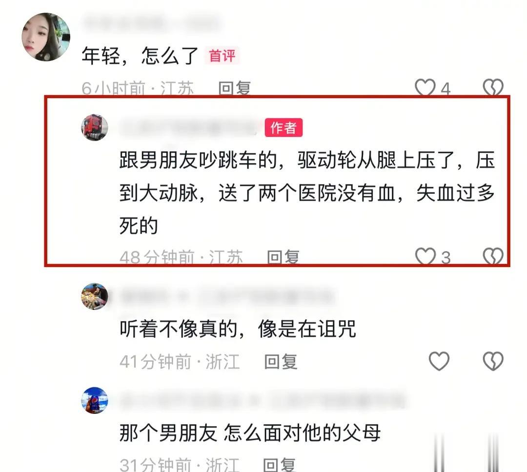 这位知情人称,王迪与男友发生了争吵,一时气不过,就跳车了,驱动轮从腿上压过,压到了大动脉,送了两家医院没有血,因失血过多离世。