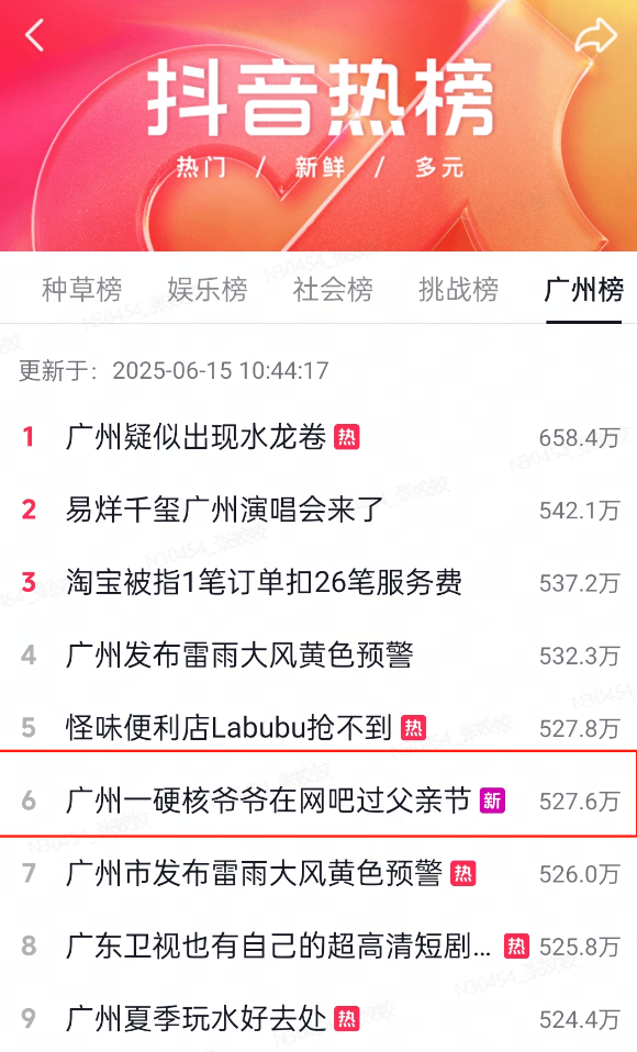 今天是2025年父亲节,本该是一家人共享天伦之乐的时刻,但一条名为“广州一硬核爷爷在网吧过父亲节"来自广州的视频却意外冲上了抖音热榜。