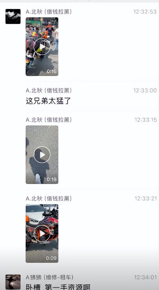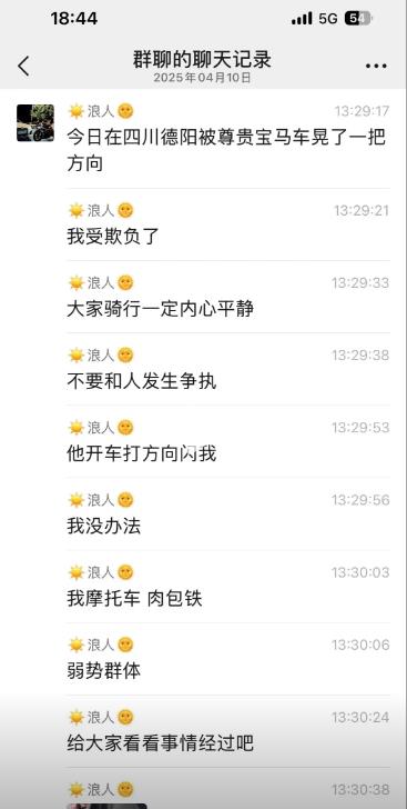 很快,一则聊天记录也在当天被曝光,据聊天记录所述,这是一个摩托车骑手群,而一个网名为浪人的人自称自己被尊贵的宝马晃了一把方向,并表示自己受欺负了,还称自己一个摩托车为弱势群体。
