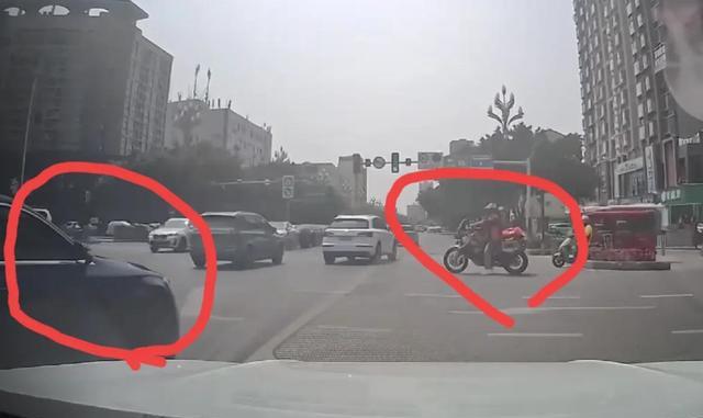 因为据行车记录仪所看,宝马车主并非故意朝着摩托车车主打方向的,该路口直行车道有三个道,而宝马车主则位于右边一道,在宝马车主前面还有一辆SUV。