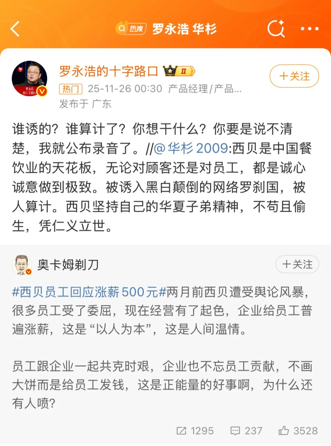 图片来源:微博 @新浪财经结果,11月25号@华杉2009(华与华营销咨询有限公司董事长)发了条微博表示“西贝是中国餐饮业的天花板,无论对顾客还是对员工,都是诚心诚意做到极致。被诱入黑白颠倒的网络罗刹国,被人算计。西贝坚持自己的华夏子弟精神,不苟且偷生,凭仁义立世。”其中的“被诱入黑白颠倒的网络罗刹国,被人算计”实在暗指谁,不用咱多说了吧。老罗也是很刚,直接表示“谁诱的?谁算计了?你想干什么?你要是说不清楚,我就公布录音了。”