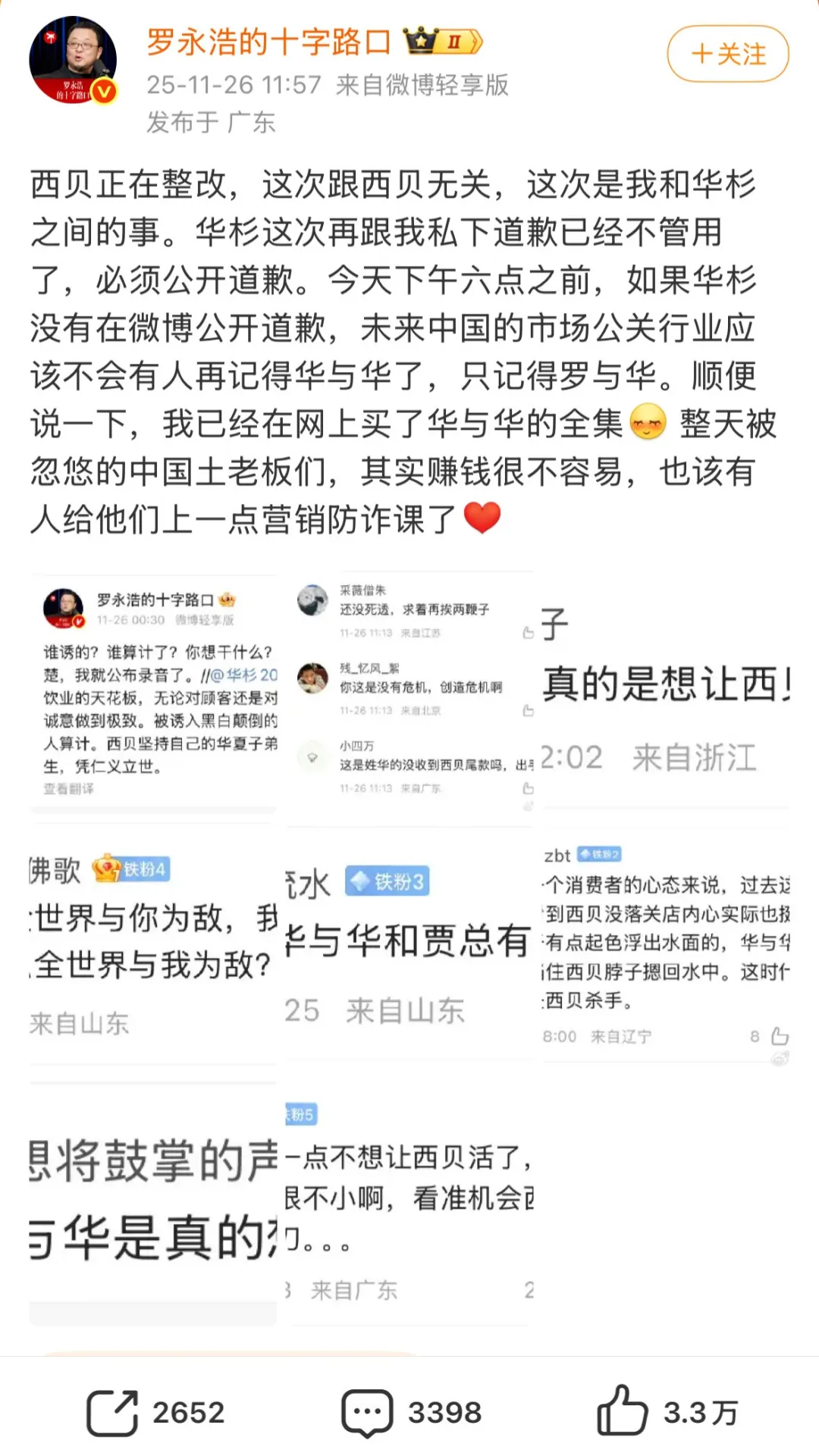 “华杉这次再跟我私下道歉已经不管用了,必须公开道歉。今天下午六点之前(11月26日),如果华杉没有在微博公开道歉,未来中国的市场公关行业应该不会有人再记得华与华了,只记得罗与华。”