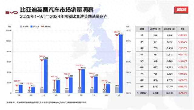 2025年9月,比亚迪英国乘用车销量达11271辆,实现欧洲单一市场月销破万,同比增880%、环比增541%;前九月累计销量35604辆,同比增576.9%,超越特斯拉、Mini等品牌同期在英销量。
