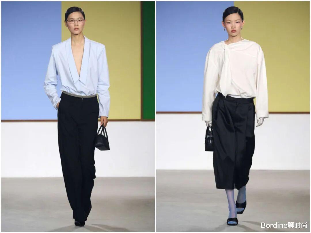 浅色颜色的上衣在深V字、不对称的打结褶皱等设计的结合上,为纯色的上衣增加了不少细节的设计感,而在和黑色等深色下装之间的搭配中,让撞色的效果更为强烈,还在直筒裤的裤装上也多了线条的利落干练。