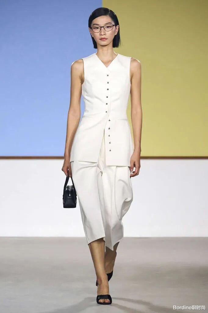 白色颜色的服装在套装的穿搭中,纯白色颜色的简约大方也更多了极简的休闲日常感,还在宽松廓形的线条上,以一些纽扣元素的出现,多了细节的时尚。