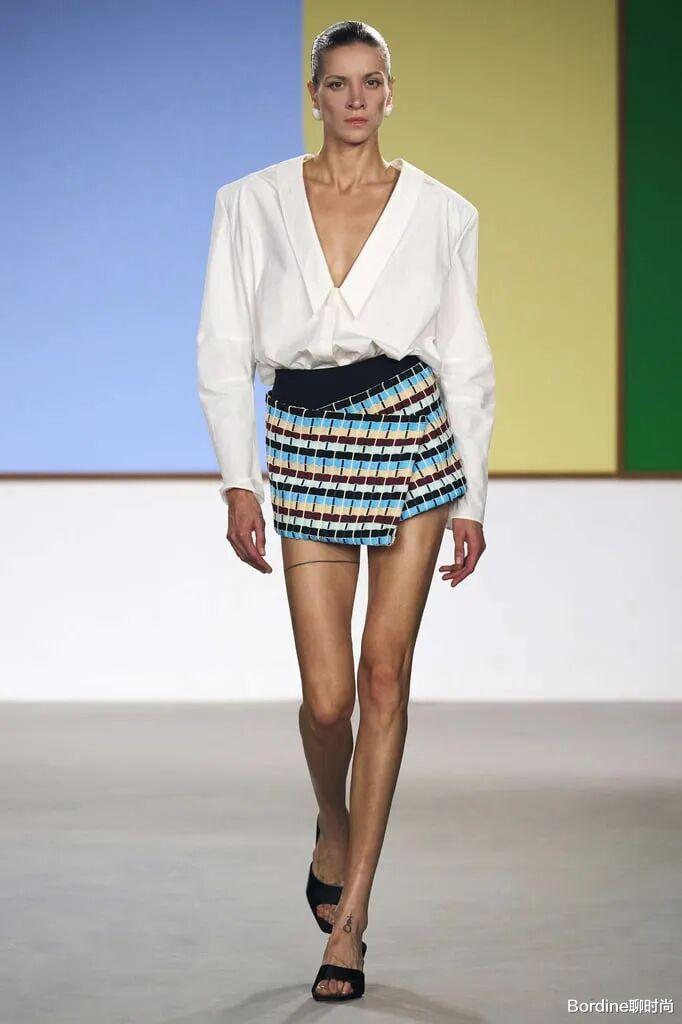 在经典黑白色彩的对比中,白色上衣在宽松的线条上,挺括的面料也多了一些利落精干的气质,以光泽面料也增加了不少材质的纹理质感和奢华华丽的高级感。