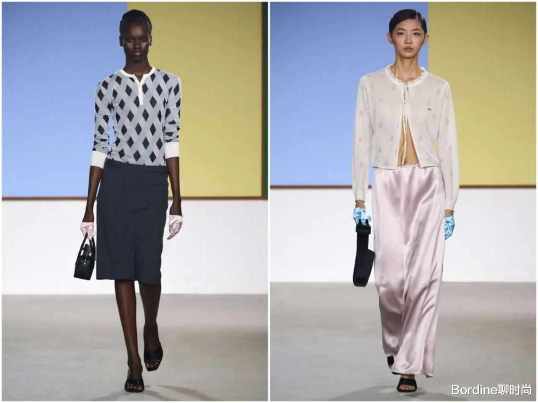 浅色系颜色在低调的气质中,柔和的氛围在光滑的绸缎面料上多了光泽和一些华丽的气质感,而在和纯黑色之间的搭配中,撞色的冲击也凸显了这些浅色部分的存在时尚感。
