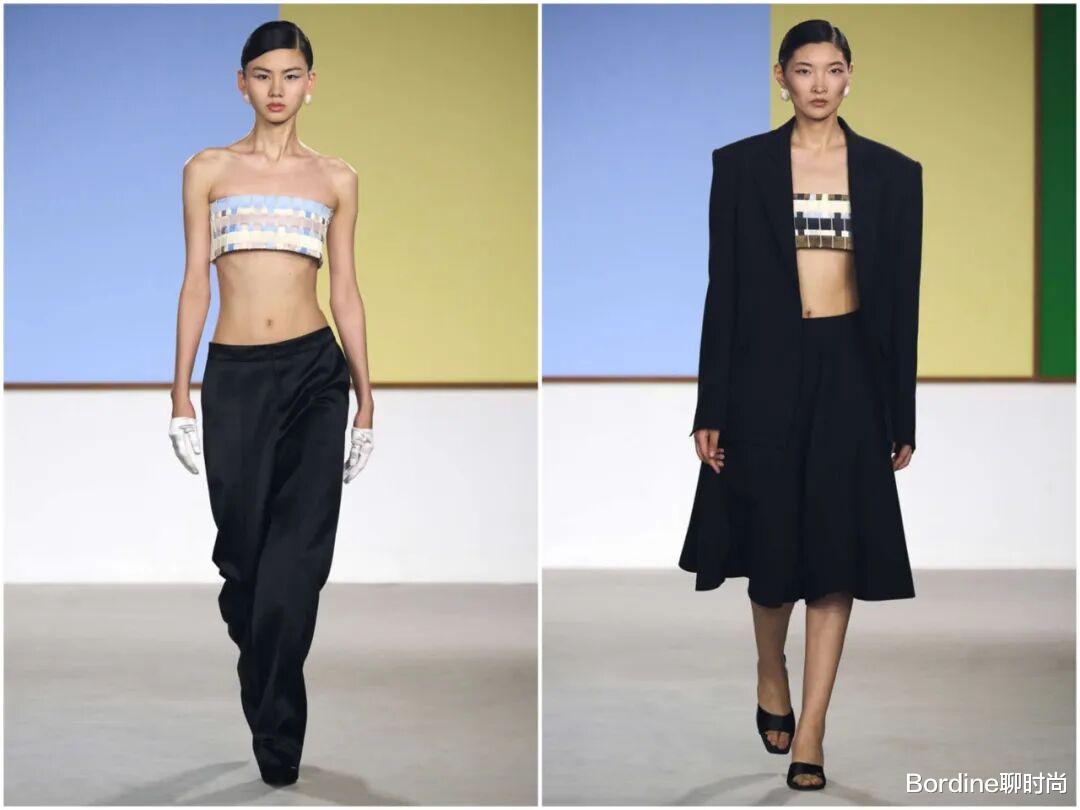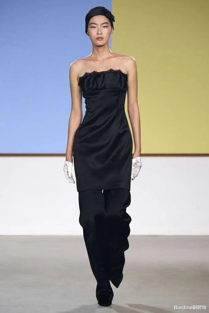 黑色的抹胸套装在这些稳重沉稳的严肃中,纯色的极简大方,抹胸也露出了肩颈的曲线线条感,而直筒裤的搭配也有不少套装的简约利落。