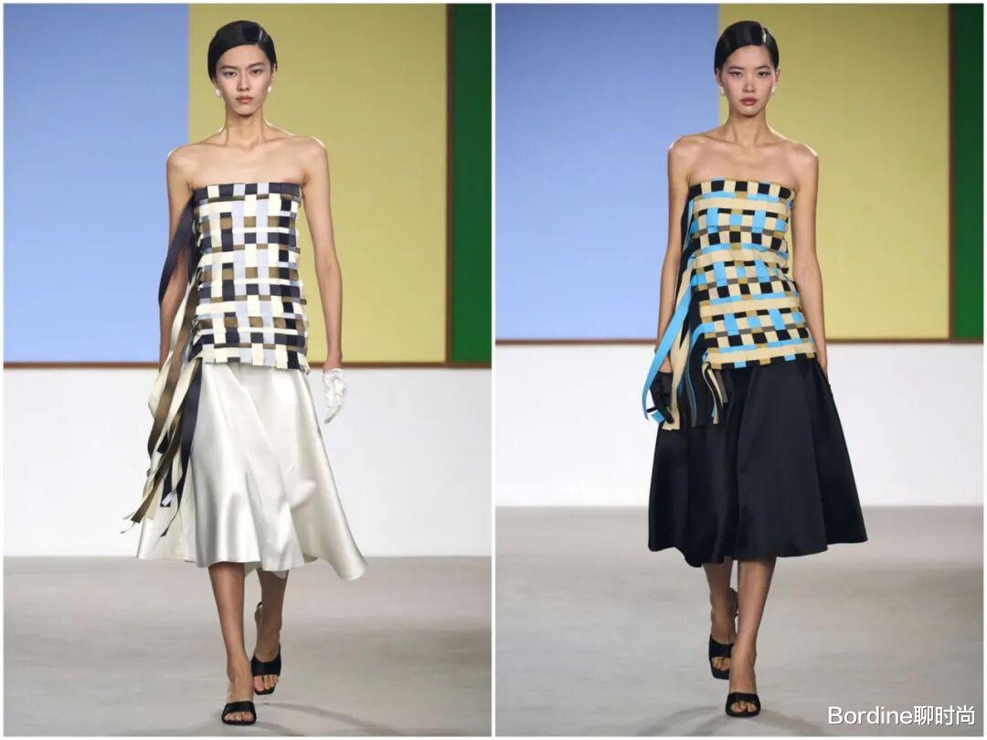 抹胸的服装在上衣的位置,色彩之间的对比搭配在编织的工艺中增加了纹理质感和格纹图案的经典时髦气质,在身侧的位置以流苏的设计增加了一些细节和不对称的冲击感;而搭配中,经典百搭的纯黑白色彩作为裙装,凸显了编织花纹上衣的存在感。
